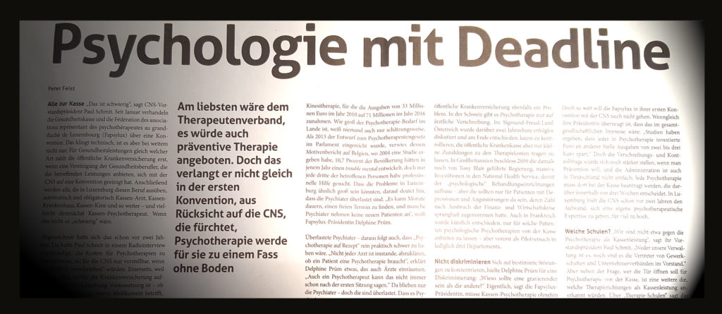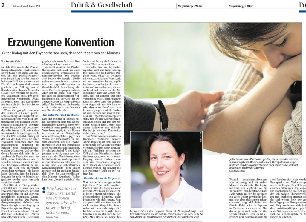 La FAPSYLUX représente les psychothérapeutes dans les rapports avec les organismes de sécurité sociale et s’engage dans l’intérêt supérieur du patient, ceci dans le respect des principes fondamentaux d’une pratique psychothérapeutique libre.